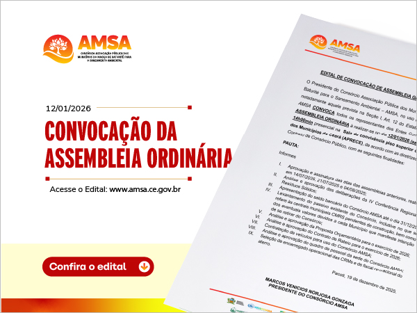 O Consórcio Associação Pública dos Municípios do Maciço de Baturité para o Saneamento Ambiental (Amsa) anunciou a convocação de seus representantes para a Assembleia Geral Ordinária, marcada para o dia 12 de janeiro de 2026, às 14h, na Sala de Convivência da Associação dos Municípios do Ceará (Aprece), em Fortaleza.